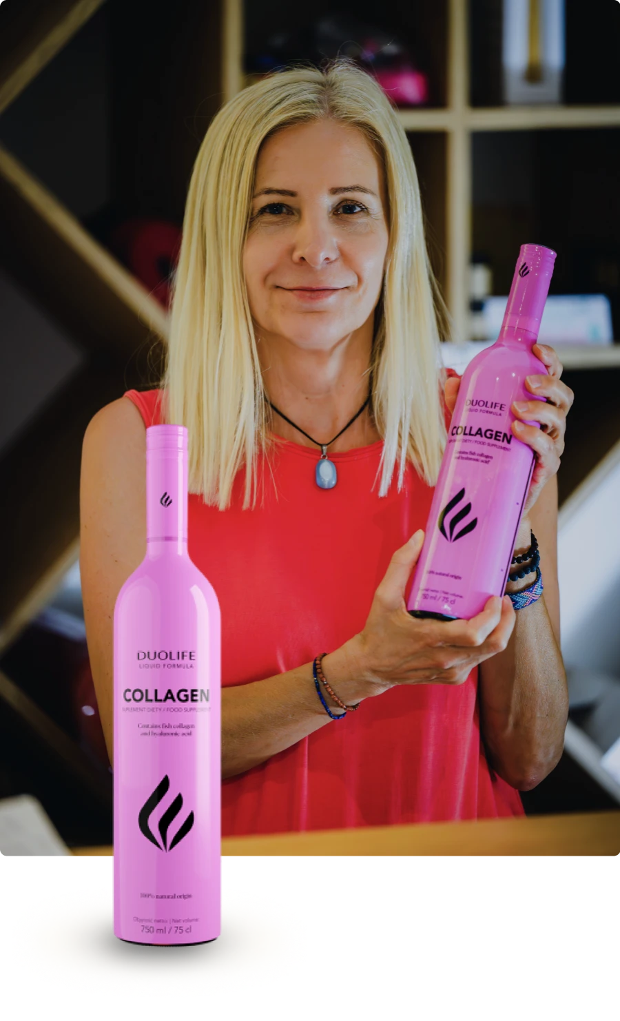 Kolagen morski, siarczan glukozaminy, siarczan chondroityny, ekstrakt z: aceroli, pokrzywy, pędów bambusa, skrzypu polnego, kwas hialuronowy, puree z owoców mango.
